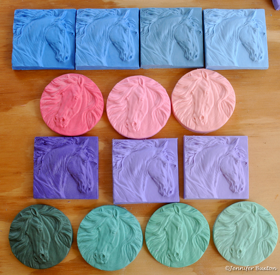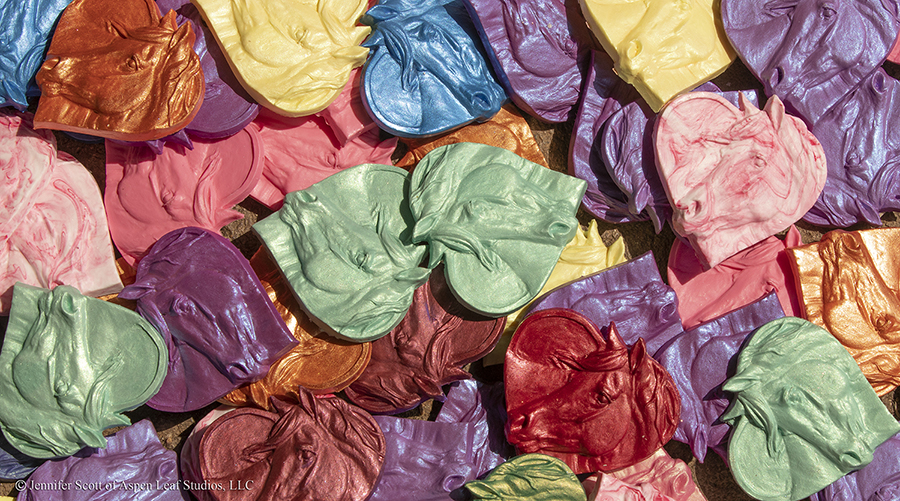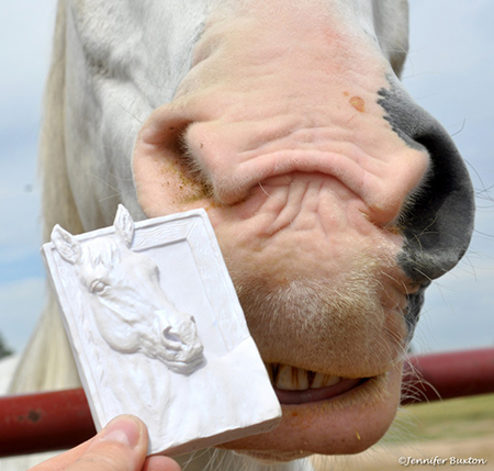 "Santana"and "Myr" medallions - TJS represents all of Jennifer Buxton and Jennifer Scott's favorite things. So we had two particular horses in mind when I scupted our Sectional Champ/Res. Champ medallions. Santana is Jennifer Buxton's "favorite person." As you can see, our medallion is Santana approved! Myr is still in the works, but he's a portrait of a gelding that was my first horse I owned as an adult after a long break. He's also our TJS Logo horse!